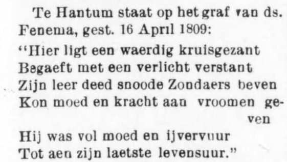 Sommigen (waaronder ik) weten nog dat er een kerk stond aan de Kompagnonswei; deze kerk is in 1975 afgebrand. De steen in de muur van de voormalige pastorie bevat de naam Ankien L Bouma en 26 september 1874. Dus naast het 300 jarig jubileum van de NH kerk hebben we ook het 150 jarig jubileum van de Gereformeerde Gemeente. Leuk weetje is dat de grond ooit in bezit is geweest van een dominee, Ds Wytse Arends Fenema (18-06-1730 Rottevalle-16-04-1809 Hantum) die ooit de krant heeft gehaald. Zijn vader Wytse kocht het huis wat er toen stond van Sjoerd Geerts. |
