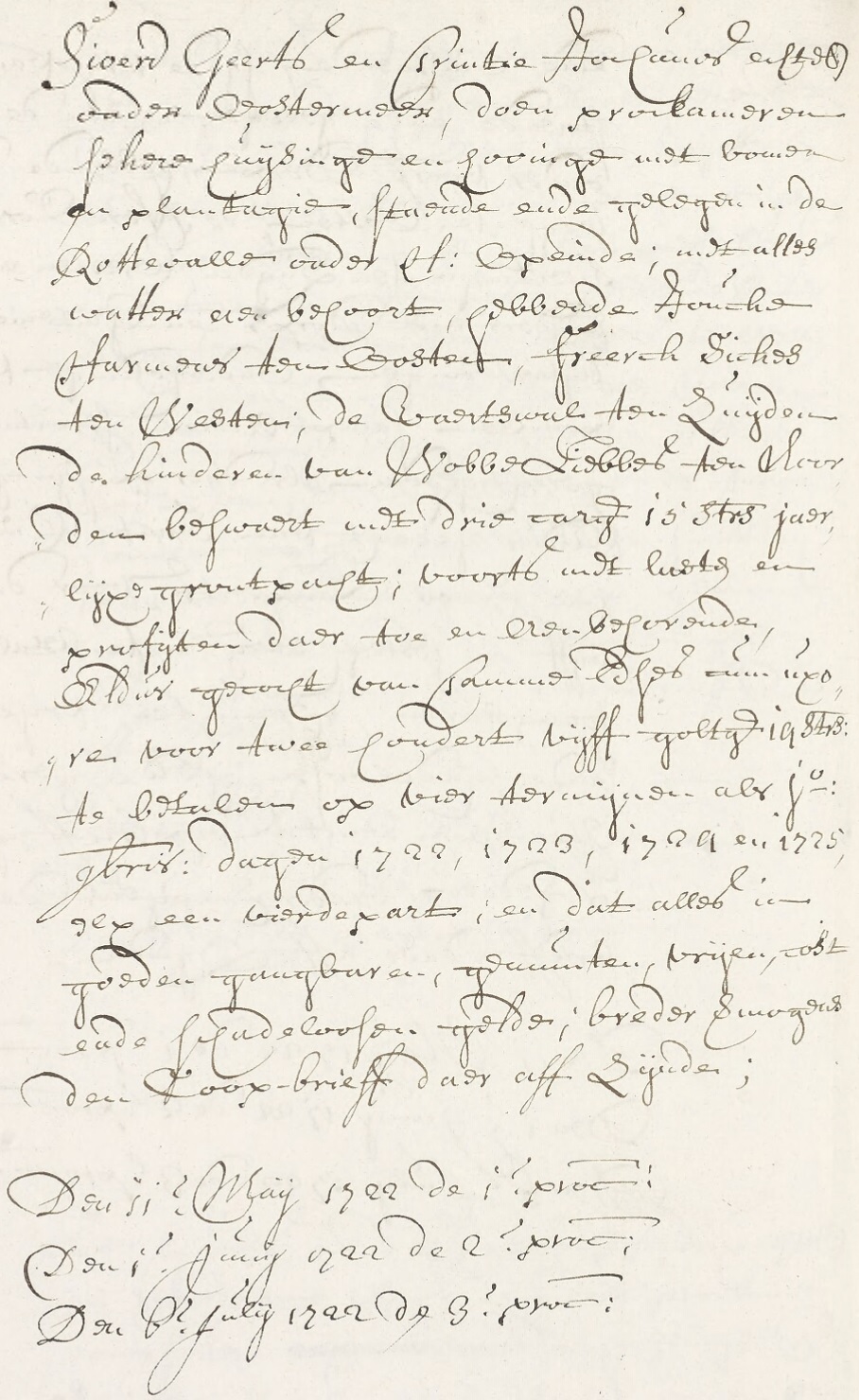 Sjoerd Geerts en Trintie Jochums echtelieden onder Oostermeer, doen proclameren zekere huisinge en hovinge met bomen en plantagie, staande ende gelegen in de Rottevalle onder H: (arkema) Opeinde; met alles watter aan behoort, hebbende Jouke Harmens ten oosten, Freerk Sickes ten westen; de vaartswal ten zuiden de kinderen van Wobbe Liebbes ten noorden bezwaard met 3 caroliguldens 15 stuivers jaarlijkse grondpacht; voorts met lasten en profijten daar toe en aanbehorende Aldus gekocht van Tamme Edses voor 205 goltguldens 19 stuivers te betalen op 4 termijnen als 1e november dagen 1722, 1723, 1724, en 1725, elks een vierde part; en dit alles in goeden gangbare, gemunte, vrije, cost en schadeloze gelde; breder vermogens den coopbrief daar aff zijnde Den 11e maij 1722 de 1e proclamatie Den 1e junij 1722 de 2e proclamatie Den 6e juli 1722 de 3e proclamatie |