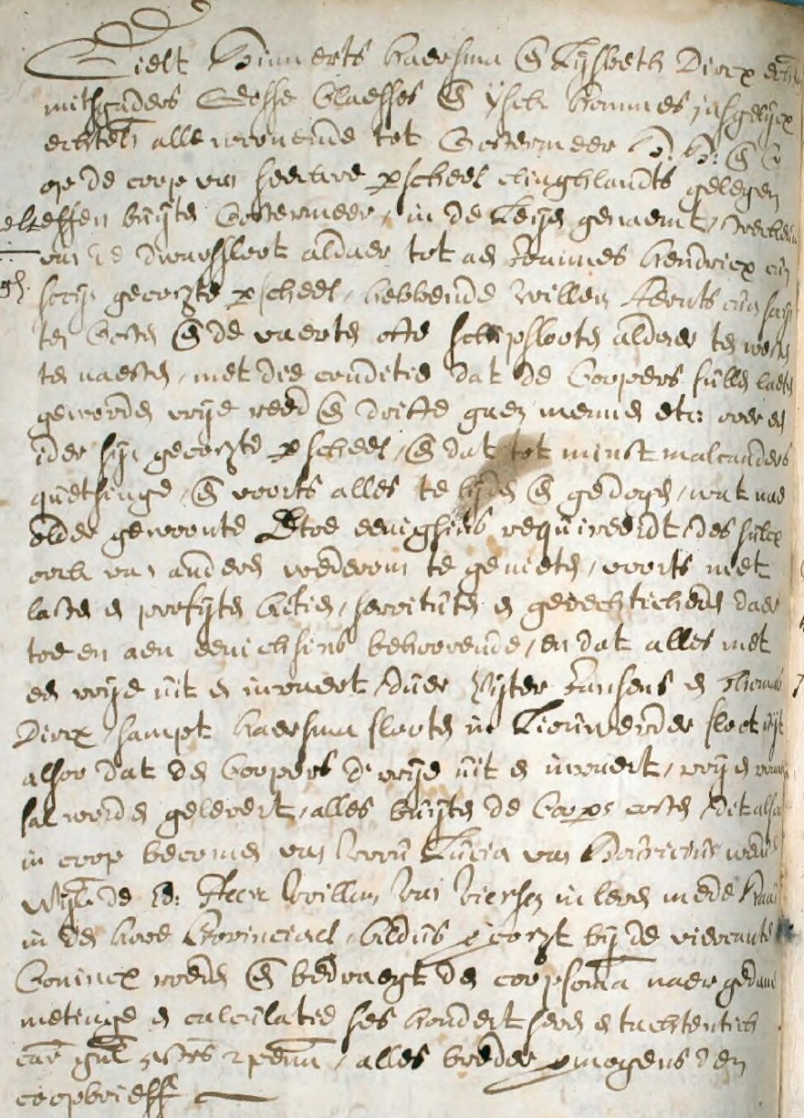 Gielt binnerts Haarsma en Lysbeth Dirks echtelieden mitsgaders Gosse Clases en Yskje Hommes insgelijks echtelieden alle wonende tot Oostermeer BB en C (begeren bod en consent) op de koop van zekere perceel clingland gelegen effen buiten Oostermeer "in de leijen" genaamd welke van de dwarsslott aldaar tot aan Johannes Hendriks cum socius gekochte perceel, hebbende Willem Aarnts cum socius ten oosten en de vaarten ofte schipsloten aldaar ten westen ten naasten, met die conditie dat de copers zullen laten geworden vrije reed en drift, gaan, mennen etc over elk ieder zijn gekochte perceel, en dat tot minst malkandere kwetsinge en voorts alles te lijden en gedogen wat na older gewoonte daartoe enigszins requireert, des zulks ook van anderen wederom te genieten voorts met lasten en profijten actien servituten en gerechtigheden daartoe en aan enigszins behorende, en dat alles met een vrije uit en invaart duer Pieter Jansens en Thomas Dirks, sampt Haarsma sloten in Leeuwardersloot uitalso dat de copers de vrije uit en invaart, vrij en vrank zal worden geleverd, alles buiten de copers kosten dit also in koop becomen van vrouw Lucia van Bouricius weduwe wijlen de edele heer Willem van Viersen in leven mede raad in de hove provinciaal, alsus verkocht bij de vierkante koningsroede en bedraagt de koopsom na gedane metinge en calculatie 687 caroliguldens 5 stuivers en 2 penningen alles breder vermogens den koopbrief. |