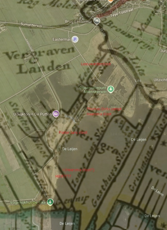 Bij het uitzoeken van wat mijn voorouders bezighield, kwam ik uit bij een koopakte van Gjalt Binnerts Haarsma van een stuk "clingland" effen buiten Oostermeer genaamd "in de leijen". Dit stuk grond werd gebruikt om clingh/clijn te graven en af te voeren. Wat op zich wel interessant is dat deze koopakte van 1679 is toen er nog helemaal geen leijen was zoals nu, maar het een grote veenafgraving was met allerlei "schipsloten" om de turf af te voeren, uitendelijk via de Lits. Op de kaart van schotanus uit 1718 is goed te zien dat de sloten daar ook namen hadden. De namen Leeuwardersloot, Pieter Jans sloot, Jonge Jans sloot, staatensloot, tiekesloot, gennip en gasthuissloot zijn daar te vinden. In onderstaande akte worden ook nog de Thomas Dirks en Haarsma sloot genoemd, die staan niet op de kaart, maar zijn nu wel ergens in de buurt te plaatsen. Overigens zal de turfwinning in deze contreien al wel tientallen jaren aan de gang zijn geweest. Ook toen er al de eerste kadastervermeldingen waren (in 1832) was hier nog een vermelding van de Leijen. De geregte helft over hoog en laag van twee bunders twintig roeden en tien ellen hooiland, leijen genaamd ten kadaster in de gemeente oostermeer sectie C genaamd Putten bekend onder nummer 69, waarvan de wederhelft toebehoort aan Oebele Andries van der Veer, koemelker te oostermeer. |
